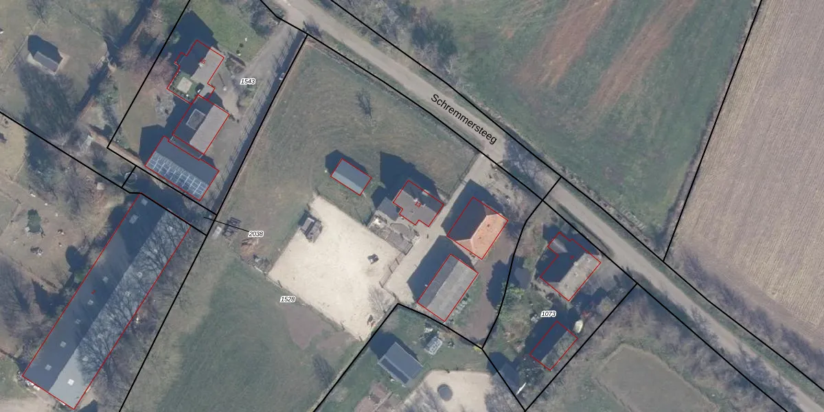Het perceel waarop Schremmersteeg 13 staat heeft een oppervlakte van 7080 m². Dit is een zeer groot perceel. De perceeloppervlakte wordt geregistreerd door het Kadaster. Gedetailleerde informatie over de maten van dit perceel kunt u vinden in het rapport Kadastrale kaart met maatvoering van Schremmersteeg 13.
