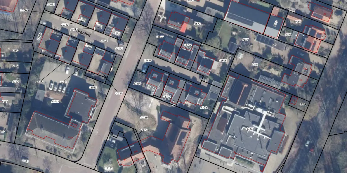 Het perceel waarop Torenhof 12 staat heeft een oppervlakte van 172 m². Dit is een middelgroot perceel. De perceeloppervlakte wordt geregistreerd door het Kadaster. Gedetailleerde informatie over de maten van dit perceel kunt u vinden in het rapport Kadastrale kaart met maatvoering van Torenhof 12.