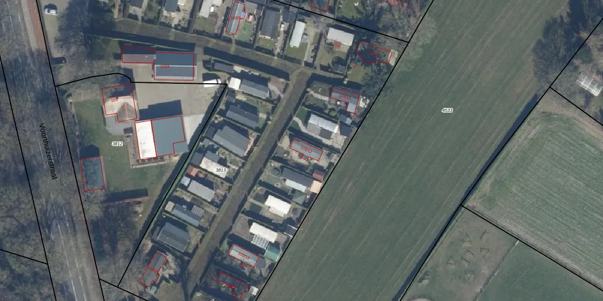 Het perceel waarop Voorthuizerstraat 103-12 staat heeft een oppervlakte van 7360 m². Dit is een zeer groot perceel. De perceeloppervlakte wordt geregistreerd door het Kadaster. Gedetailleerde informatie over de maten van dit perceel kunt u vinden in het rapport Kadastrale kaart met maatvoering van Voorthuizerstraat 103-12.
