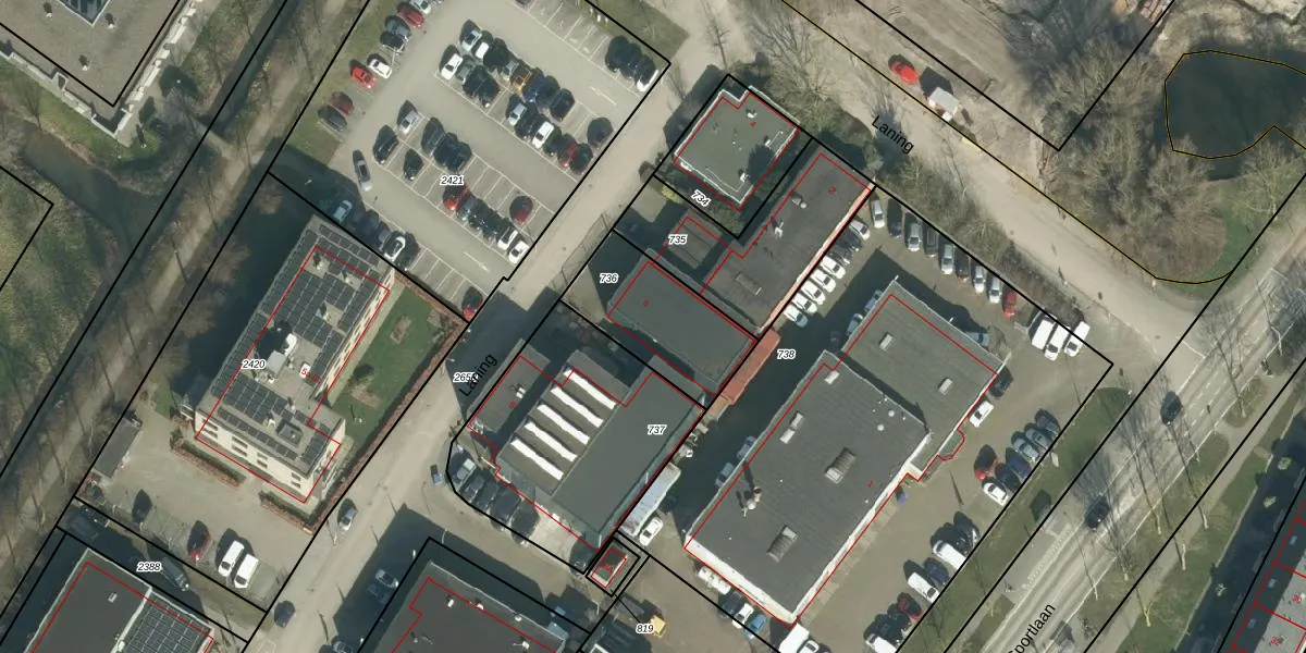 Het perceel waarop Laning 6 staat heeft een oppervlakte van 377 m². Dit is een groot perceel. De perceeloppervlakte wordt geregistreerd door het Kadaster. Gedetailleerde informatie over de maten van dit perceel kunt u vinden in het rapport Kadastrale kaart met maatvoering van Laning 6.