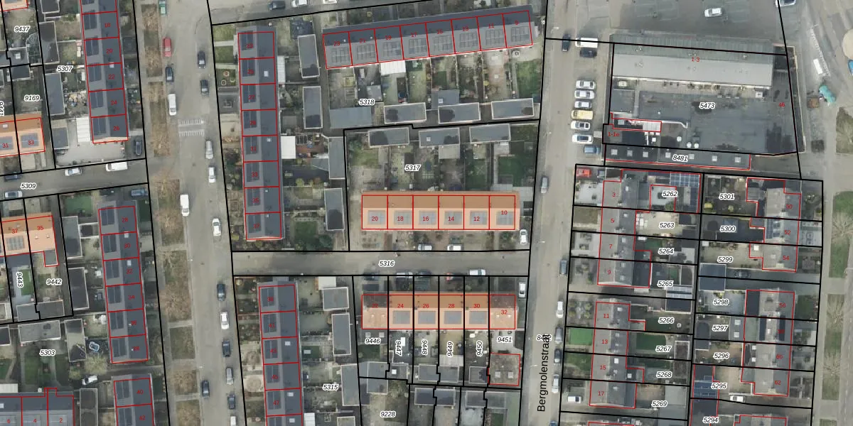 Het perceel waarop Bergmolenstraat 16 staat heeft een oppervlakte van 1295 m². Dit is een zeer groot perceel. De perceeloppervlakte wordt geregistreerd door het Kadaster. Gedetailleerde informatie over de maten van dit perceel kunt u vinden in het rapport Kadastrale kaart met maatvoering van Bergmolenstraat 16.