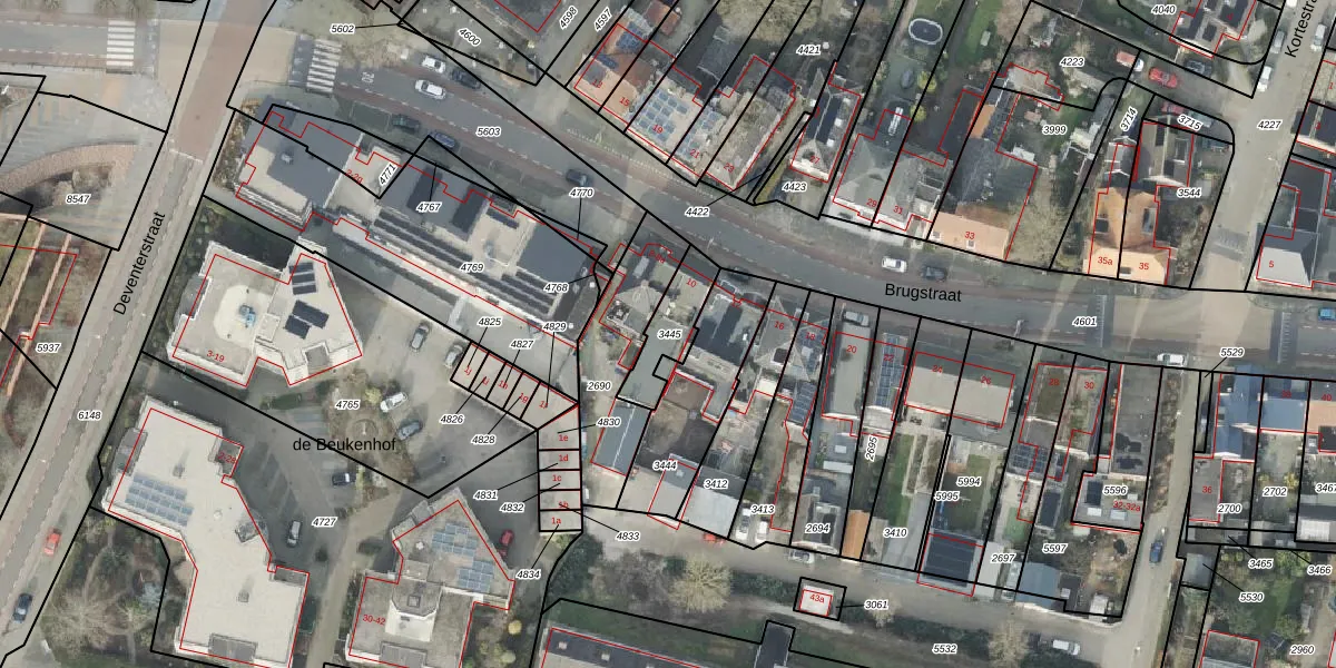 Brugstraat 10-b is gelegen op kadastraal perceel RTE00F3445. Deze kadastrale aanduiding is uniek en wordt gebruikt door het Kadaster om eigendomsrechten en andere zakelijke rechten vast te leggen. Het perceel maakt onderdeel uit van de kadastrale gemeente Raalte.