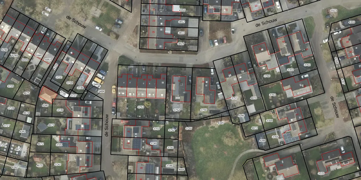 Het perceel waarop de Schouw 54 staat heeft een oppervlakte van 402 m². Dit is een groot perceel. De perceeloppervlakte wordt geregistreerd door het Kadaster. Gedetailleerde informatie over de maten van dit perceel kunt u vinden in het rapport Kadastrale kaart met maatvoering van de Schouw 54.