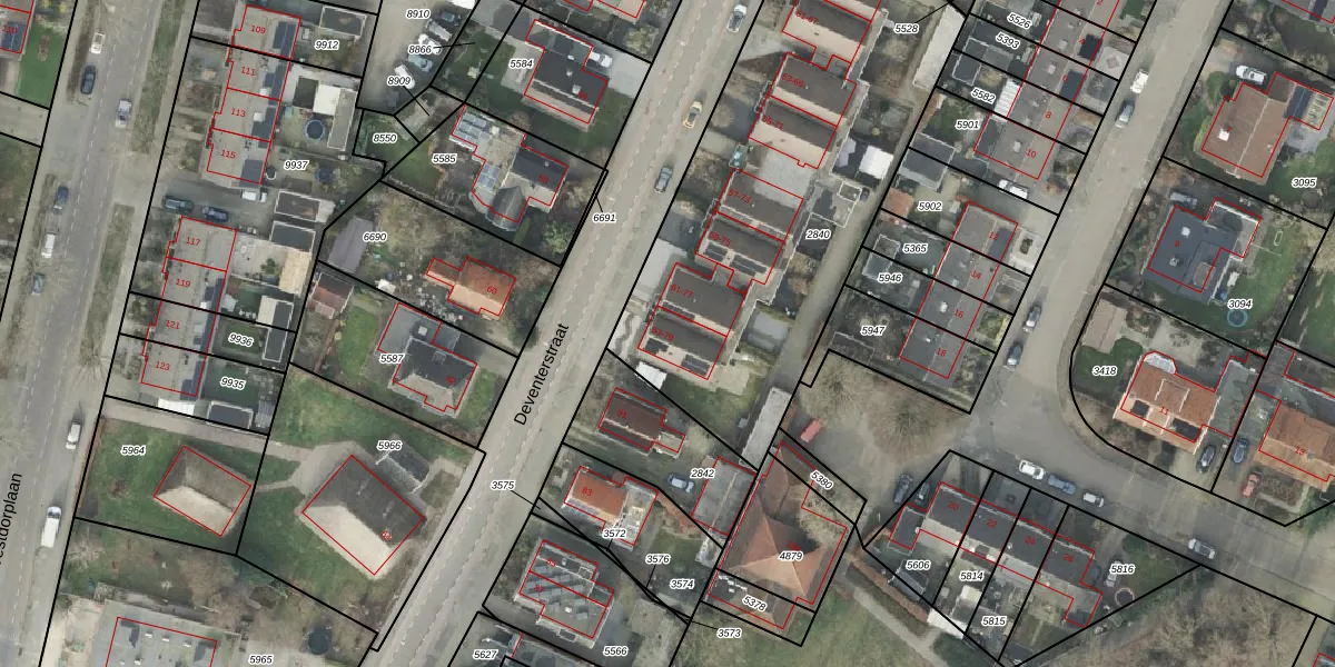 Het perceel waarop Deventerstraat 63 staat heeft een oppervlakte van 2160 m². Dit is een zeer groot perceel. De perceeloppervlakte wordt geregistreerd door het Kadaster. Gedetailleerde informatie over de maten van dit perceel kunt u vinden in het rapport Kadastrale kaart met maatvoering van Deventerstraat 63.