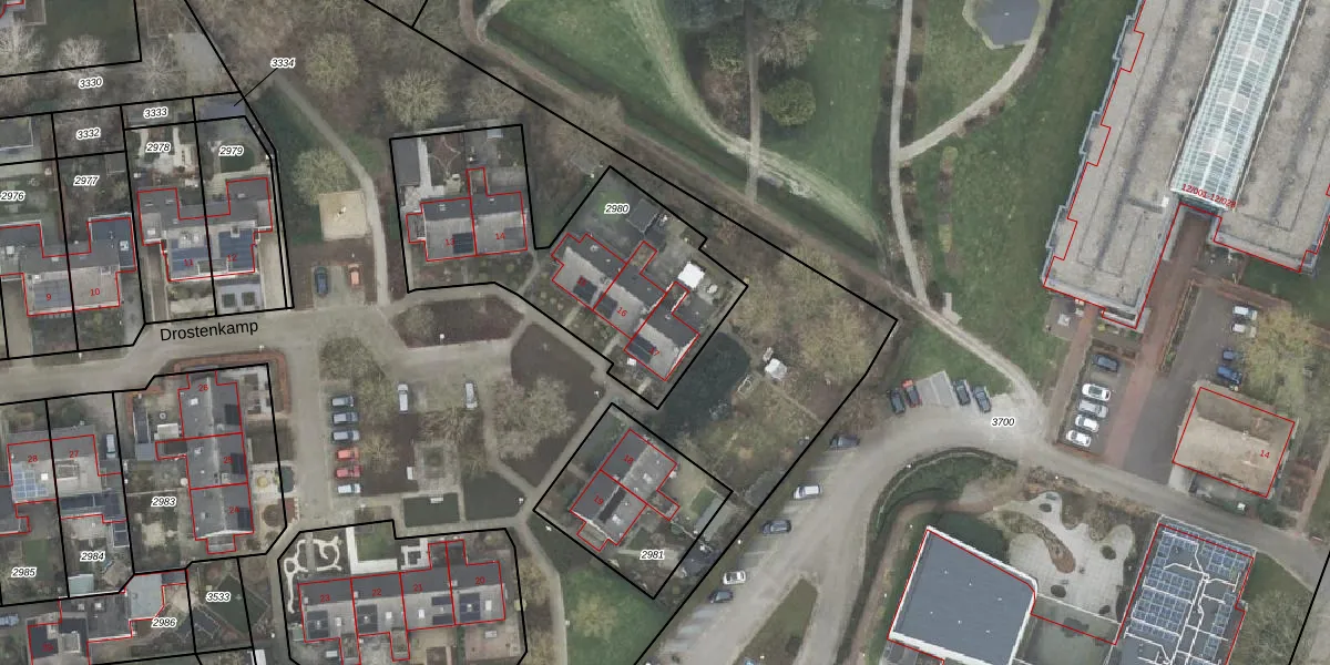 Het perceel waarop Drostenkamp 17 staat heeft een oppervlakte van 1112 m². Dit is een zeer groot perceel. De perceeloppervlakte wordt geregistreerd door het Kadaster. Gedetailleerde informatie over de maten van dit perceel kunt u vinden in het rapport Kadastrale kaart met maatvoering van Drostenkamp 17.