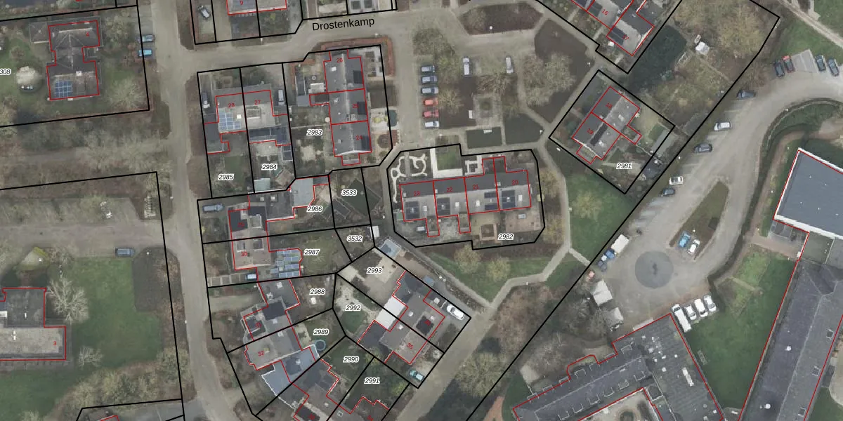 Het perceel waarop Drostenkamp 23 staat heeft een oppervlakte van 780 m². Dit is een groot perceel. De perceeloppervlakte wordt geregistreerd door het Kadaster. Gedetailleerde informatie over de maten van dit perceel kunt u vinden in het rapport Kadastrale kaart met maatvoering van Drostenkamp 23.