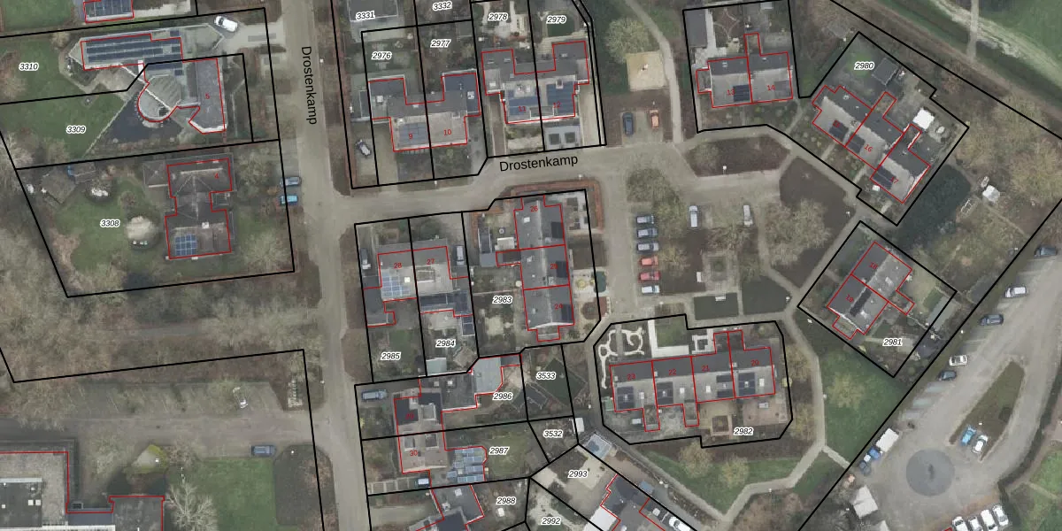 Het perceel waarop Drostenkamp 25 staat heeft een oppervlakte van 663 m². Dit is een groot perceel. De perceeloppervlakte wordt geregistreerd door het Kadaster. Gedetailleerde informatie over de maten van dit perceel kunt u vinden in het rapport Kadastrale kaart met maatvoering van Drostenkamp 25.