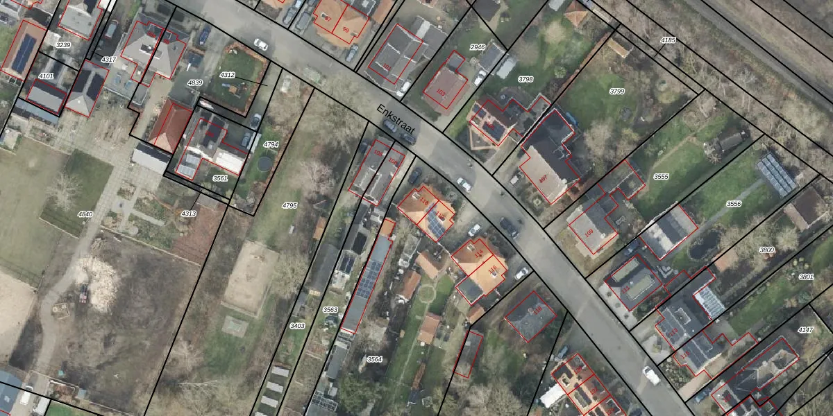 Het perceel waarop Enkstraat 110 staat heeft een oppervlakte van 1998 m². Dit is een zeer groot perceel. De perceeloppervlakte wordt geregistreerd door het Kadaster. Gedetailleerde informatie over de maten van dit perceel kunt u vinden in het rapport Kadastrale kaart met maatvoering van Enkstraat 110.