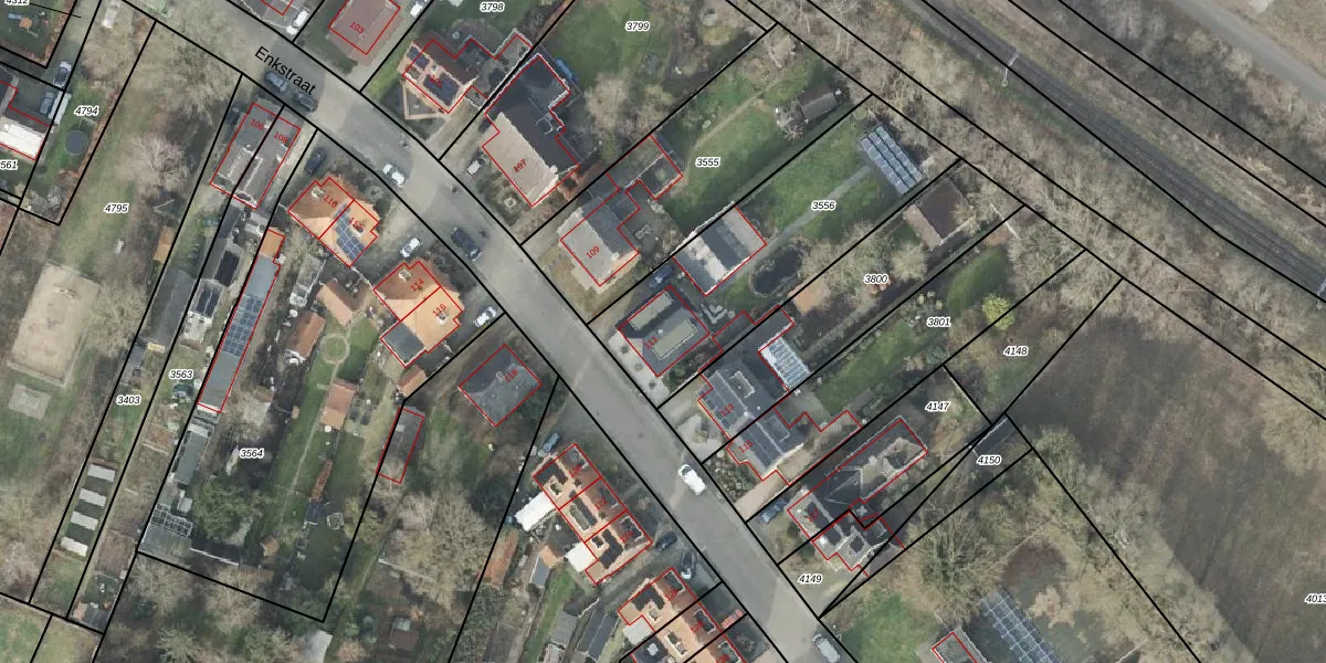 Het perceel waarop Enkstraat 111 staat heeft een oppervlakte van 930 m². Dit is een groot perceel. De perceeloppervlakte wordt geregistreerd door het Kadaster. Gedetailleerde informatie over de maten van dit perceel kunt u vinden in het rapport Kadastrale kaart met maatvoering van Enkstraat 111.