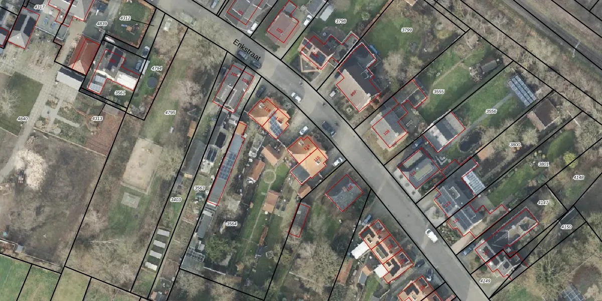 Het perceel waarop Enkstraat 114 staat heeft een oppervlakte van 1998 m². Dit is een zeer groot perceel. De perceeloppervlakte wordt geregistreerd door het Kadaster. Gedetailleerde informatie over de maten van dit perceel kunt u vinden in het rapport Kadastrale kaart met maatvoering van Enkstraat 114.