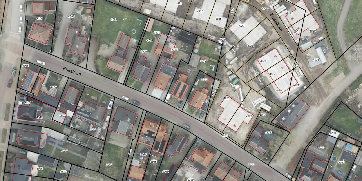 Het perceel waarop Enkstraat 15 staat heeft een oppervlakte van 560 m². Dit is een groot perceel. De perceeloppervlakte wordt geregistreerd door het Kadaster. Gedetailleerde informatie over de maten van dit perceel kunt u vinden in het rapport Kadastrale kaart met maatvoering van Enkstraat 15.