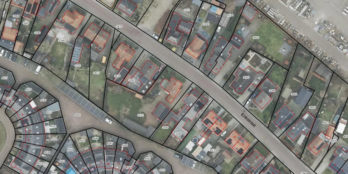 Het perceel waarop Enkstraat 30 staat heeft een oppervlakte van 1073 m². Dit is een zeer groot perceel. De perceeloppervlakte wordt geregistreerd door het Kadaster. Gedetailleerde informatie over de maten van dit perceel kunt u vinden in het rapport Kadastrale kaart met maatvoering van Enkstraat 30.