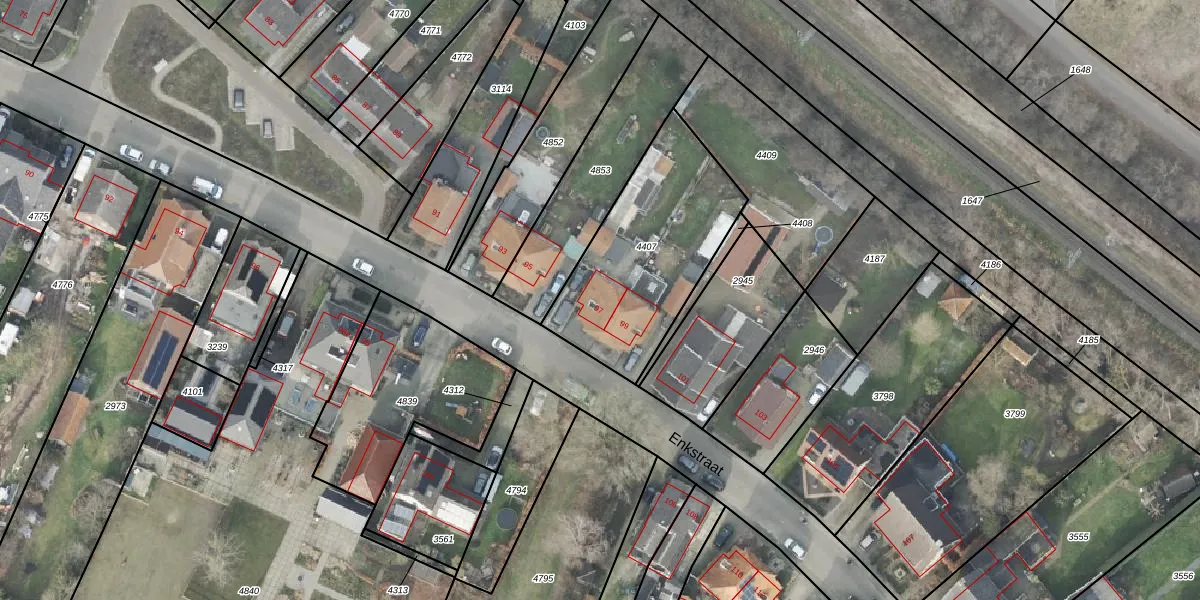 Het perceel waarop Enkstraat 97 staat heeft een oppervlakte van 735 m². Dit is een groot perceel. De perceeloppervlakte wordt geregistreerd door het Kadaster. Gedetailleerde informatie over de maten van dit perceel kunt u vinden in het rapport Kadastrale kaart met maatvoering van Enkstraat 97.