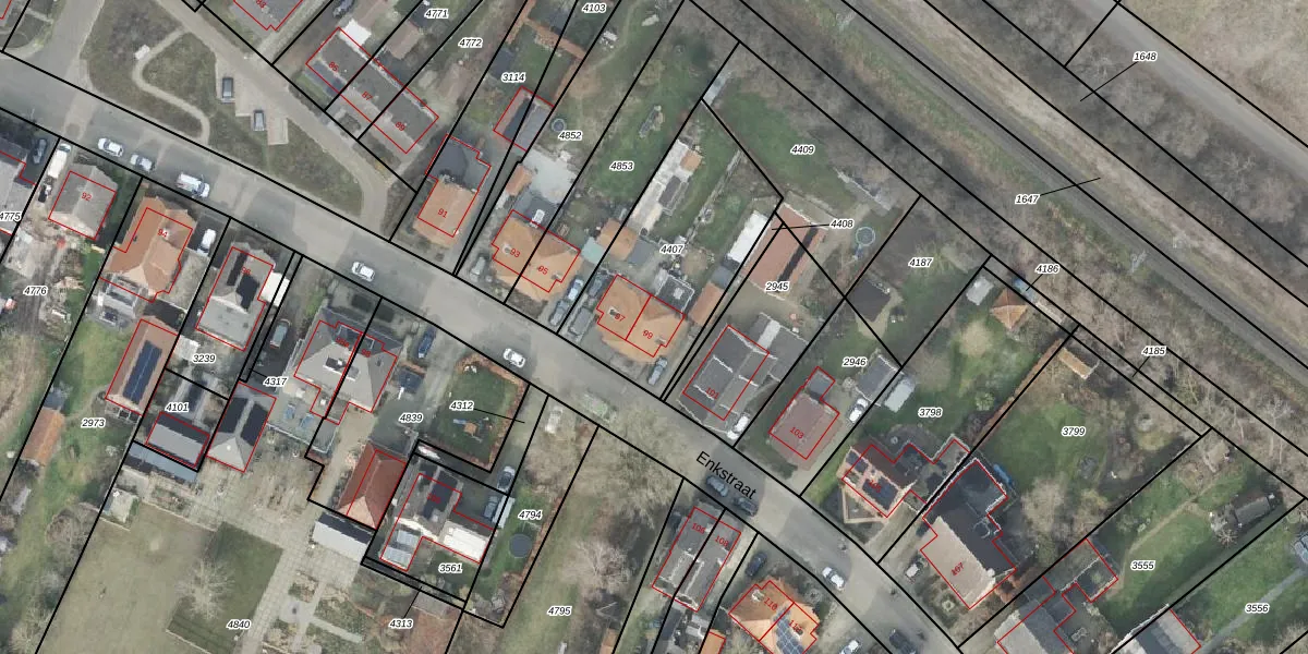 Het perceel waarop Enkstraat 99 staat heeft een oppervlakte van 735 m². Dit is een groot perceel. De perceeloppervlakte wordt geregistreerd door het Kadaster. Gedetailleerde informatie over de maten van dit perceel kunt u vinden in het rapport Kadastrale kaart met maatvoering van Enkstraat 99.