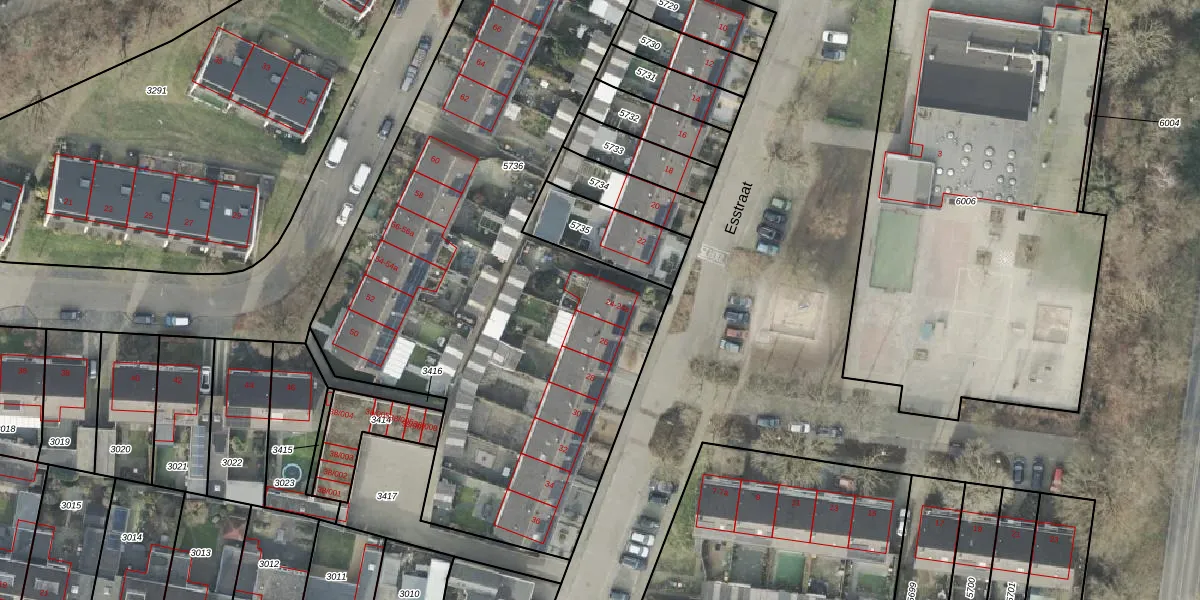 Het perceel waarop Esstraat 24-a staat heeft een oppervlakte van 3440 m². Dit is een zeer groot perceel. De perceeloppervlakte wordt geregistreerd door het Kadaster. Gedetailleerde informatie over de maten van dit perceel kunt u vinden in het rapport Kadastrale kaart met maatvoering van Esstraat 24-a.