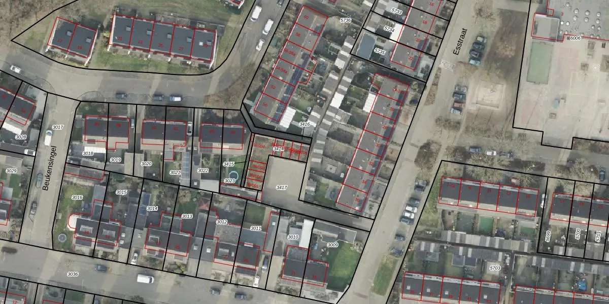 Het perceel waarop Esstraat 38-008 staat heeft een oppervlakte van 185 m². Dit is een middelgroot perceel. De perceeloppervlakte wordt geregistreerd door het Kadaster. Gedetailleerde informatie over de maten van dit perceel kunt u vinden in het rapport Kadastrale kaart met maatvoering van Esstraat 38-008.
