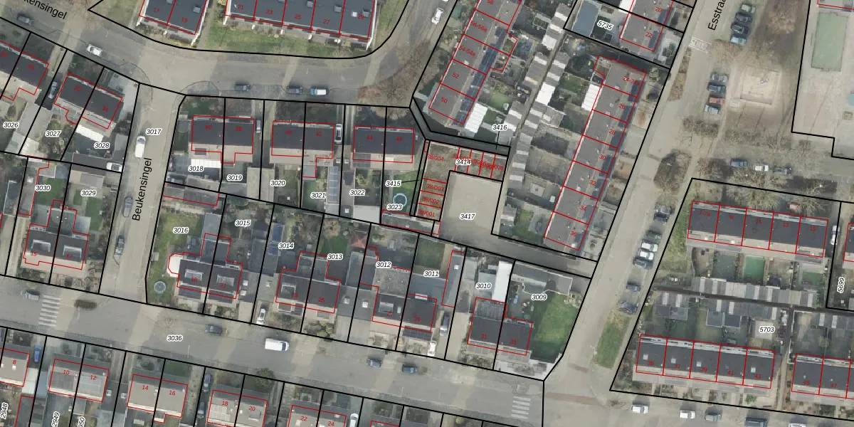 Het perceel waarop Esstraat 38-001 staat heeft een oppervlakte van 185 m². Dit is een middelgroot perceel. De perceeloppervlakte wordt geregistreerd door het Kadaster. Gedetailleerde informatie over de maten van dit perceel kunt u vinden in het rapport Kadastrale kaart met maatvoering van Esstraat 38-001.