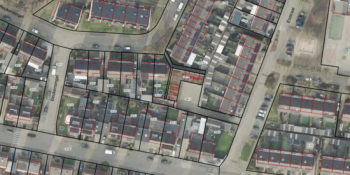 Het perceel waarop Esstraat 38-003 staat heeft een oppervlakte van 185 m². Dit is een middelgroot perceel. De perceeloppervlakte wordt geregistreerd door het Kadaster. Gedetailleerde informatie over de maten van dit perceel kunt u vinden in het rapport Kadastrale kaart met maatvoering van Esstraat 38-003.