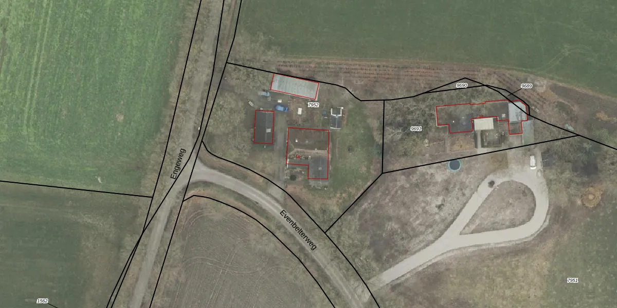 Het perceel waarop Evenbelterweg 16 staat heeft een oppervlakte van 1990 m². Dit is een zeer groot perceel. De perceeloppervlakte wordt geregistreerd door het Kadaster. Gedetailleerde informatie over de maten van dit perceel kunt u vinden in het rapport Kadastrale kaart met maatvoering van Evenbelterweg 16.