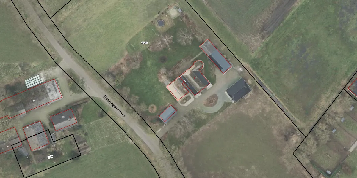 Het perceel waarop Evenbelterweg 2 staat heeft een oppervlakte van 1,0 ha. Dit is een zeer groot perceel. De perceeloppervlakte wordt geregistreerd door het Kadaster. Gedetailleerde informatie over de maten van dit perceel kunt u vinden in het rapport Kadastrale kaart met maatvoering van Evenbelterweg 2.