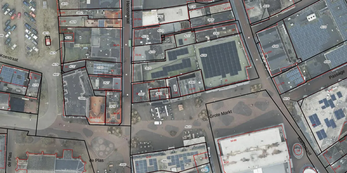 Het perceel waarop Grote Markt 9-a staat heeft een oppervlakte van 71 m². Dit is een klein perceel. De perceeloppervlakte wordt geregistreerd door het Kadaster. Gedetailleerde informatie over de maten van dit perceel kunt u vinden in het rapport Kadastrale kaart met maatvoering van Grote Markt 9-a.