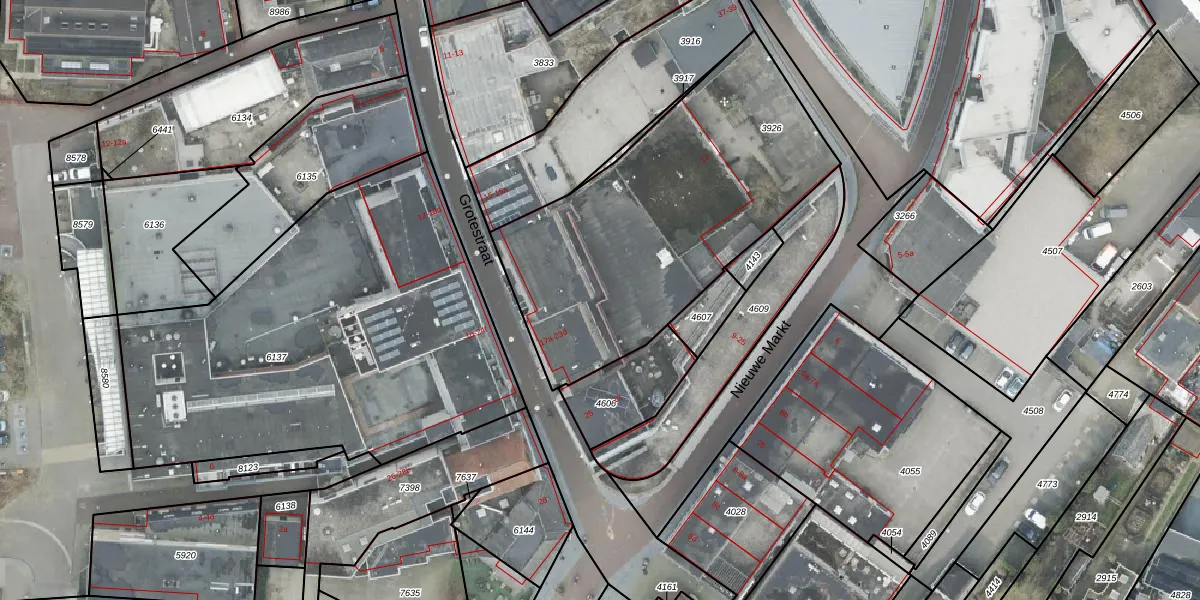 Het perceel waarop Grotestraat 21-a staat heeft een oppervlakte van 1566 m². Dit is een zeer groot perceel. De perceeloppervlakte wordt geregistreerd door het Kadaster. Gedetailleerde informatie over de maten van dit perceel kunt u vinden in het rapport Kadastrale kaart met maatvoering van Grotestraat 21-a.