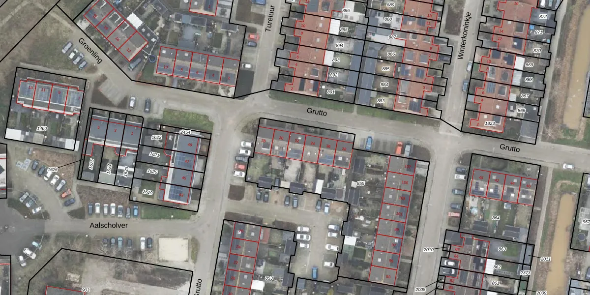 Het perceel waarop Grutto 32 staat heeft een oppervlakte van 1854 m². Dit is een zeer groot perceel. De perceeloppervlakte wordt geregistreerd door het Kadaster. Gedetailleerde informatie over de maten van dit perceel kunt u vinden in het rapport Kadastrale kaart met maatvoering van Grutto 32.