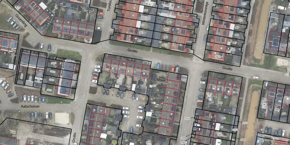 Het perceel waarop Grutto 38 staat heeft een oppervlakte van 1854 m². Dit is een zeer groot perceel. De perceeloppervlakte wordt geregistreerd door het Kadaster. Gedetailleerde informatie over de maten van dit perceel kunt u vinden in het rapport Kadastrale kaart met maatvoering van Grutto 38.