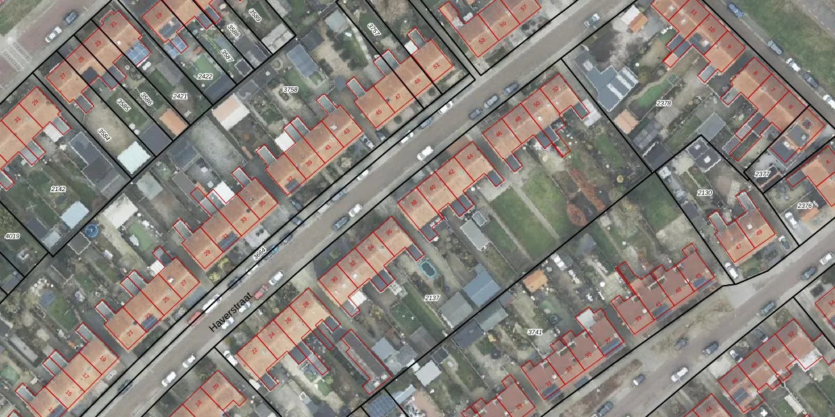 Het perceel waarop Haverstraat 38 staat heeft een oppervlakte van 3710 m². Dit is een zeer groot perceel. De perceeloppervlakte wordt geregistreerd door het Kadaster. Gedetailleerde informatie over de maten van dit perceel kunt u vinden in het rapport Kadastrale kaart met maatvoering van Haverstraat 38.