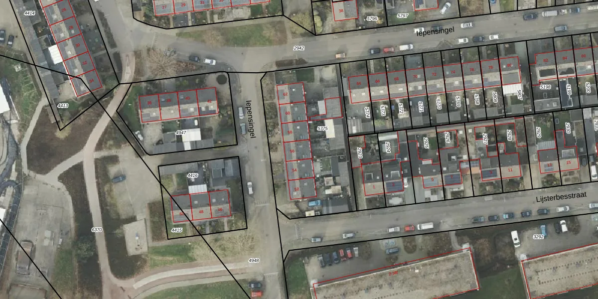 Het perceel waarop Iepensingel 56 staat heeft een oppervlakte van 1321 m². Dit is een zeer groot perceel. De perceeloppervlakte wordt geregistreerd door het Kadaster. Gedetailleerde informatie over de maten van dit perceel kunt u vinden in het rapport Kadastrale kaart met maatvoering van Iepensingel 56.