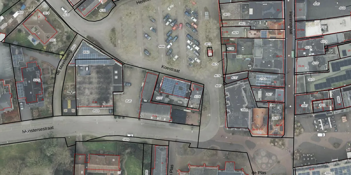Het perceel waarop Koestraat 18 staat heeft een oppervlakte van 320 m². Dit is een groot perceel. De perceeloppervlakte wordt geregistreerd door het Kadaster. Gedetailleerde informatie over de maten van dit perceel kunt u vinden in het rapport Kadastrale kaart met maatvoering van Koestraat 18.