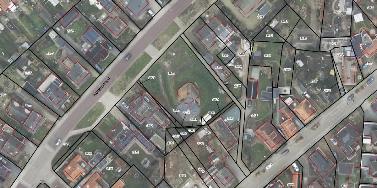 Het perceel waarop Korenstraat 25 staat heeft een oppervlakte van 1271 m². Dit is een zeer groot perceel. De perceeloppervlakte wordt geregistreerd door het Kadaster. Gedetailleerde informatie over de maten van dit perceel kunt u vinden in het rapport Kadastrale kaart met maatvoering van Korenstraat 25.