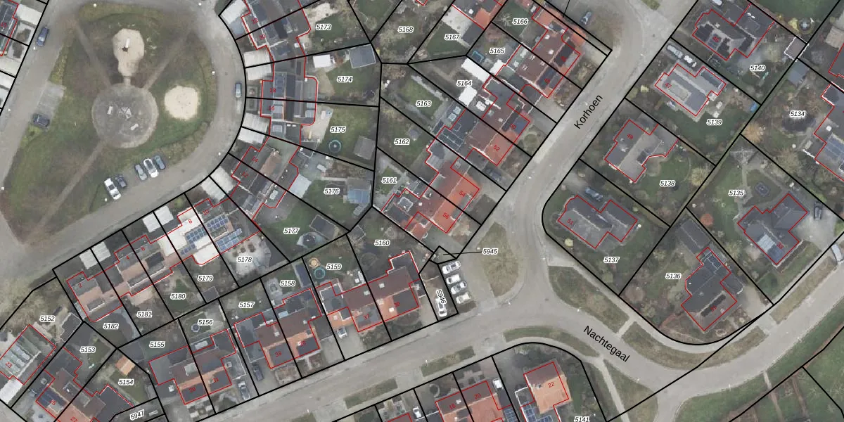 Het perceel waarop Korhoen 56 staat heeft een oppervlakte van 317 m². Dit is een groot perceel. De perceeloppervlakte wordt geregistreerd door het Kadaster. Gedetailleerde informatie over de maten van dit perceel kunt u vinden in het rapport Kadastrale kaart met maatvoering van Korhoen 56.