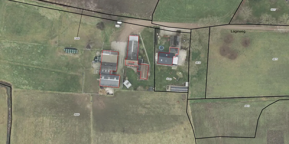 Het perceel waarop Lageweg 13-a staat heeft een oppervlakte van 2,1 ha. Dit is een zeer groot perceel. De perceeloppervlakte wordt geregistreerd door het Kadaster. Gedetailleerde informatie over de maten van dit perceel kunt u vinden in het rapport Kadastrale kaart met maatvoering van Lageweg 13-a.