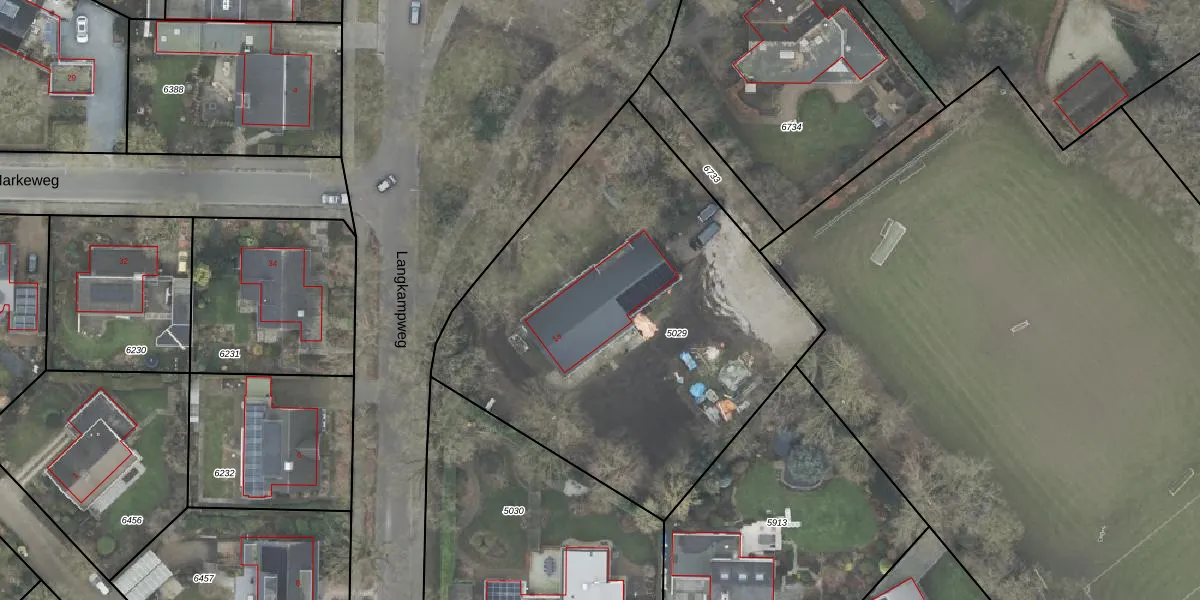 Het perceel waarop Langkampweg 1-a staat heeft een oppervlakte van 2455 m². Dit is een zeer groot perceel. De perceeloppervlakte wordt geregistreerd door het Kadaster. Gedetailleerde informatie over de maten van dit perceel kunt u vinden in het rapport Kadastrale kaart met maatvoering van Langkampweg 1-a.