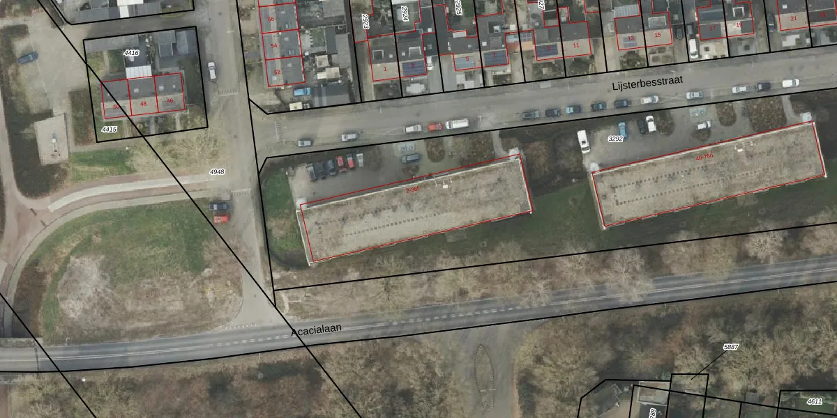 Het perceel waarop Lijsterbesstraat 22 staat heeft een oppervlakte van 6900 m². Dit is een zeer groot perceel. De perceeloppervlakte wordt geregistreerd door het Kadaster. Gedetailleerde informatie over de maten van dit perceel kunt u vinden in het rapport Kadastrale kaart met maatvoering van Lijsterbesstraat 22.