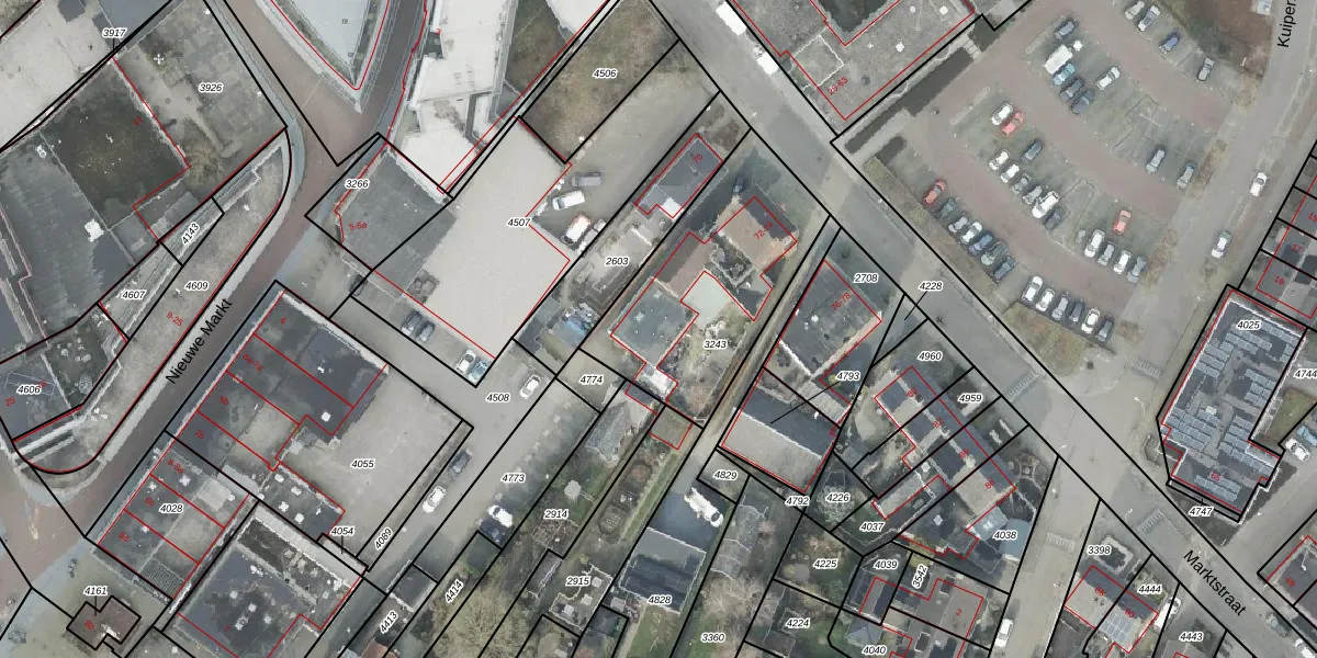 Het perceel waarop Marktstraat 72 staat heeft een oppervlakte van 815 m². Dit is een groot perceel. De perceeloppervlakte wordt geregistreerd door het Kadaster. Gedetailleerde informatie over de maten van dit perceel kunt u vinden in het rapport Kadastrale kaart met maatvoering van Marktstraat 72.