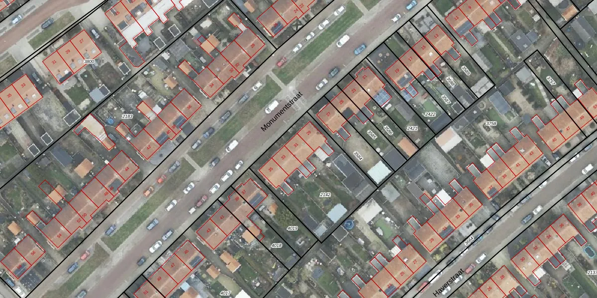Het perceel waarop Monumentstraat 31 staat heeft een oppervlakte van 930 m². Dit is een groot perceel. De perceeloppervlakte wordt geregistreerd door het Kadaster. Gedetailleerde informatie over de maten van dit perceel kunt u vinden in het rapport Kadastrale kaart met maatvoering van Monumentstraat 31.
