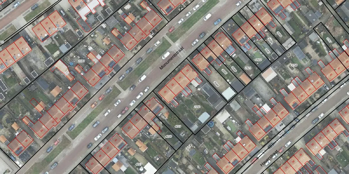 Het perceel waarop Monumentstraat 33 staat heeft een oppervlakte van 930 m². Dit is een groot perceel. De perceeloppervlakte wordt geregistreerd door het Kadaster. Gedetailleerde informatie over de maten van dit perceel kunt u vinden in het rapport Kadastrale kaart met maatvoering van Monumentstraat 33.