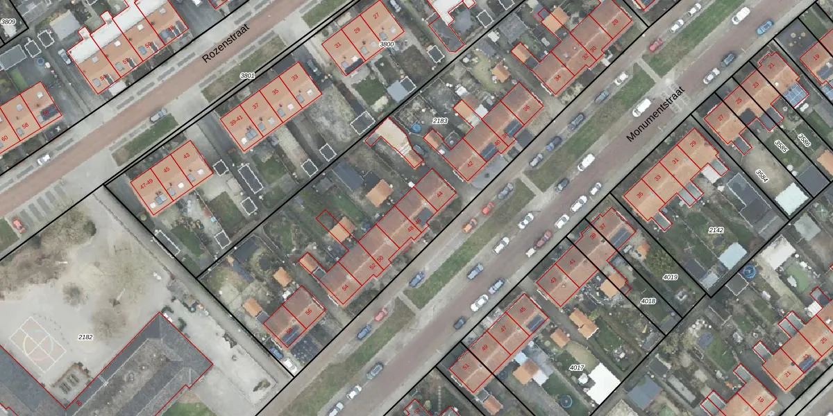 Het perceel waarop Monumentstraat 46 staat heeft een oppervlakte van 3440 m². Dit is een zeer groot perceel. De perceeloppervlakte wordt geregistreerd door het Kadaster. Gedetailleerde informatie over de maten van dit perceel kunt u vinden in het rapport Kadastrale kaart met maatvoering van Monumentstraat 46.