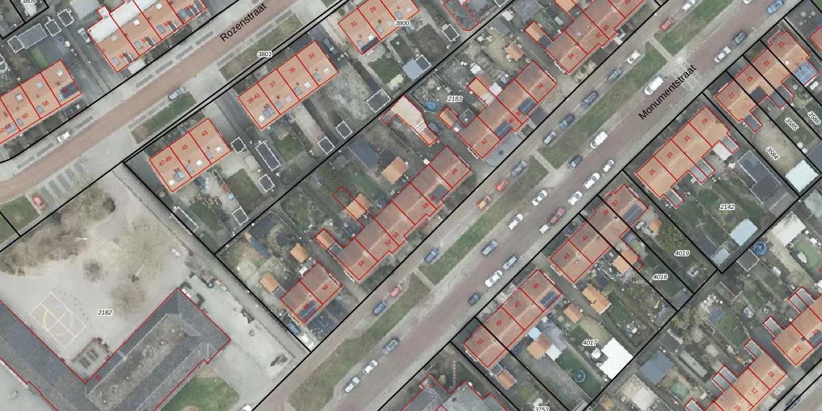Het perceel waarop Monumentstraat 48 staat heeft een oppervlakte van 3440 m². Dit is een zeer groot perceel. De perceeloppervlakte wordt geregistreerd door het Kadaster. Gedetailleerde informatie over de maten van dit perceel kunt u vinden in het rapport Kadastrale kaart met maatvoering van Monumentstraat 48.