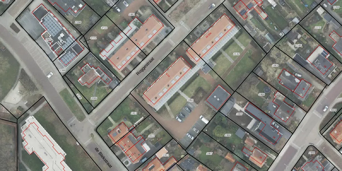 Het perceel waarop Roggestraat 12 staat heeft een oppervlakte van 1965 m². Dit is een zeer groot perceel. De perceeloppervlakte wordt geregistreerd door het Kadaster. Gedetailleerde informatie over de maten van dit perceel kunt u vinden in het rapport Kadastrale kaart met maatvoering van Roggestraat 12.
