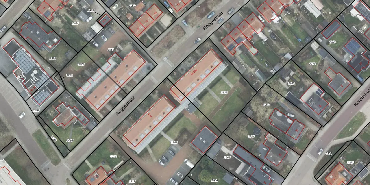 Het perceel waarop Roggestraat 16 staat heeft een oppervlakte van 1245 m². Dit is een zeer groot perceel. De perceeloppervlakte wordt geregistreerd door het Kadaster. Gedetailleerde informatie over de maten van dit perceel kunt u vinden in het rapport Kadastrale kaart met maatvoering van Roggestraat 16.