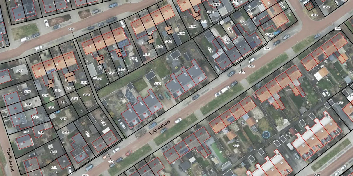 Het perceel waarop Tulpenstraat 16 staat heeft een oppervlakte van 1845 m². Dit is een zeer groot perceel. De perceeloppervlakte wordt geregistreerd door het Kadaster. Gedetailleerde informatie over de maten van dit perceel kunt u vinden in het rapport Kadastrale kaart met maatvoering van Tulpenstraat 16.
