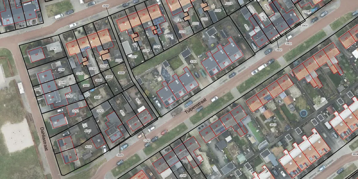Het perceel waarop Tulpenstraat 20 staat heeft een oppervlakte van 1845 m². Dit is een zeer groot perceel. De perceeloppervlakte wordt geregistreerd door het Kadaster. Gedetailleerde informatie over de maten van dit perceel kunt u vinden in het rapport Kadastrale kaart met maatvoering van Tulpenstraat 20.