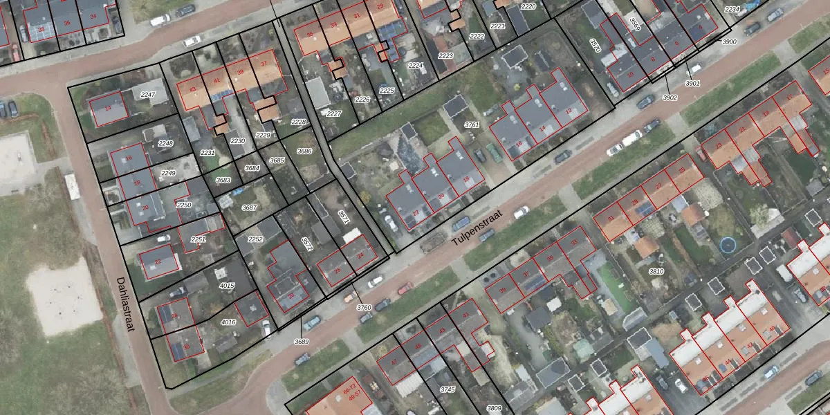 Het perceel waarop Tulpenstraat 22 staat heeft een oppervlakte van 1845 m². Dit is een zeer groot perceel. De perceeloppervlakte wordt geregistreerd door het Kadaster. Gedetailleerde informatie over de maten van dit perceel kunt u vinden in het rapport Kadastrale kaart met maatvoering van Tulpenstraat 22.
