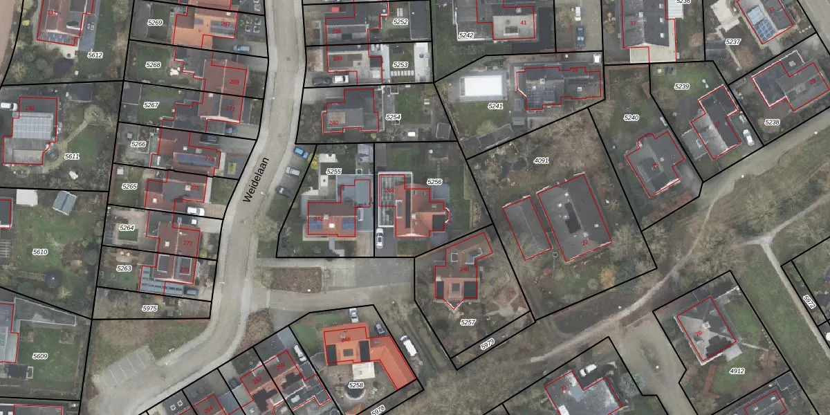 Het perceel waarop Weidelaan 244 staat heeft een oppervlakte van 639 m². Dit is een groot perceel. De perceeloppervlakte wordt geregistreerd door het Kadaster. Gedetailleerde informatie over de maten van dit perceel kunt u vinden in het rapport Kadastrale kaart met maatvoering van Weidelaan 244.