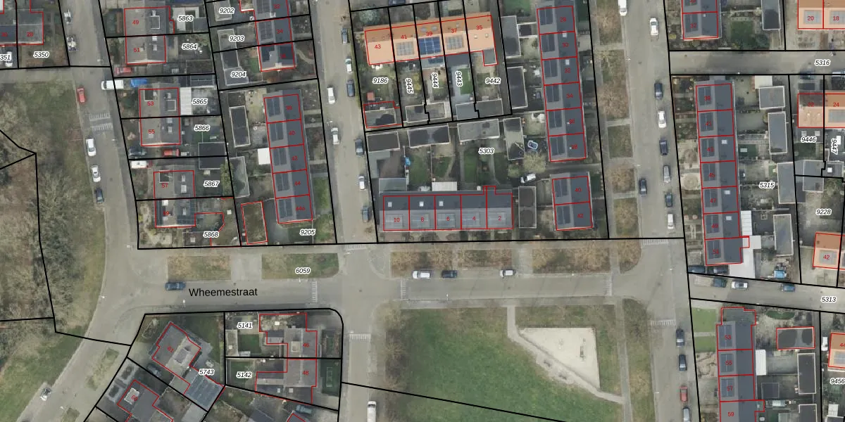 Het perceel waarop Wheemestraat 8 staat heeft een oppervlakte van 2223 m². Dit is een zeer groot perceel. De perceeloppervlakte wordt geregistreerd door het Kadaster. Gedetailleerde informatie over de maten van dit perceel kunt u vinden in het rapport Kadastrale kaart met maatvoering van Wheemestraat 8.