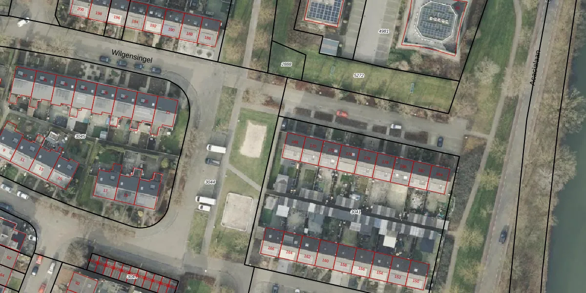 Het perceel waarop Wilgensingel 168 staat heeft een oppervlakte van 3289 m². Dit is een zeer groot perceel. De perceeloppervlakte wordt geregistreerd door het Kadaster. Gedetailleerde informatie over de maten van dit perceel kunt u vinden in het rapport Kadastrale kaart met maatvoering van Wilgensingel 168.