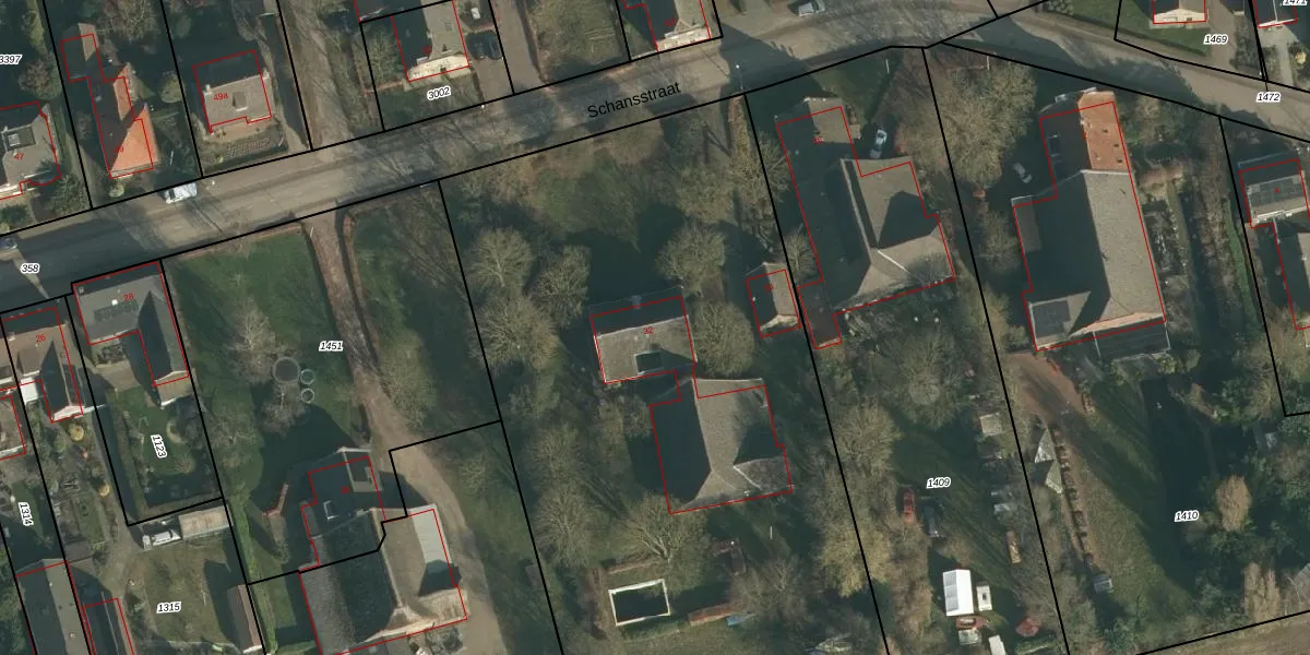 Het perceel waarop Schansstraat 32 staat heeft een oppervlakte van 9128 m². Dit is een zeer groot perceel. De perceeloppervlakte wordt geregistreerd door het Kadaster. Gedetailleerde informatie over de maten van dit perceel kunt u vinden in het rapport Kadastrale kaart met maatvoering van Schansstraat 32.